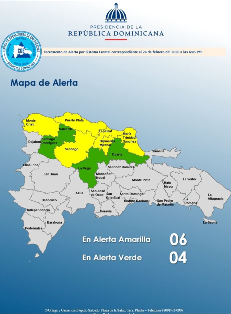 Santo Domingo. – El Centro de Operaciones de Emergencias (COE) ha elevado a 10 el número de provincias en alerta debido al desplazamiento de campos nubosos asociados a un sistema frontal casi estacionario, que se encuentra localizado al norte del país.