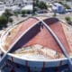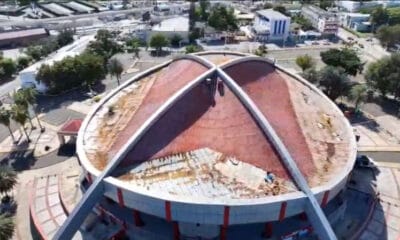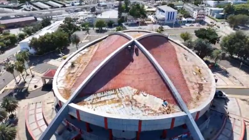 Santiago. – Una planta crece a través de uno de los orificios del deteriorado techo de la Gran Arena del Cibao, reflejando el avanzado estado de...